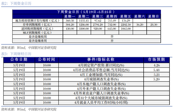 3、资金面来看,5/12-5/16央行逆回购净回笼4751亿元。本周资金面收紧,DR001/DR007分别较5/9上行14BP、10BP至1.63%、1.63%。同业存单方面,3M、1Y存单分别上行3BP、2BP至1.64%、1.69%,1Y-3M存单期限利差下行1BP至4.4BP,6M-3M存单期限利差下行2BP至2.5BP。对于下周,国债发行规模较大且期限偏长,需关注供给带来的扰动。