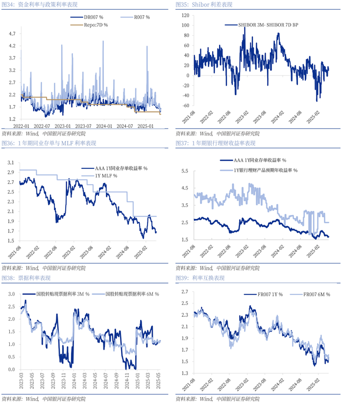 利率方面:关税谈判超预期回摆,市场前期对于基本面的悲观预期得到大幅修正。往后看,基本面由外需冲击下拖累转为观测国内需求端的实际修复进度,同时资金面可能受税期及供给等因素扰动,短期债市偏震荡。考虑到市场主要扰动因素为中美贸易谈判结果,十债收益率至多回到4月美国公布关税之前(1.8%),同时考虑到期间10BP政策利率调降,因此10年国债在1.7%左右为较好的增配点位,关注供给冲击预期下超调的超长债利差压降的配置价值。短端方面,主要受资金面和央行态度及操作影响,当前资金利率于5月12-15日维持在1.4%的政策利率相应位置左右,使得短端继续下行空间有限,若下周资金面在国债集中供给和税期等因素影响下收紧,可能导致短端利率上行,关注短端博弈交易性机会;长端方面,考虑到市场主要扰动因素为中美贸易谈判结果,十债收益率至多回到4月美国公布关税之前(1.8%),同时期间10BP政策利率调降,因此10年国债在1.7%左右为较好的增配点位,同时关注供给冲击预期下超调的超长债利差压降的配置价值。