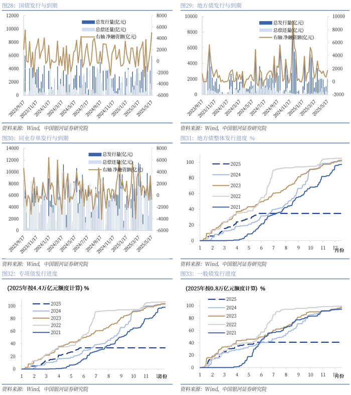 2、供给方面,5/12-5/16利率债发行规模整体小幅回落,发行国债5904.9亿元(特别国债2800亿元)、地方债1972.5亿元,同业存单5139.9亿元,整体较上周回落326.49亿元。国债、地方债、存单发行规模较上周分别变化2194.9亿元、917.9亿元、-3439.3亿元;按新增专项债和新增一般债额度分别为4.4万亿元和0.8万亿元计算,本周地方债整体发行进度达到32.5%(2021-2024年同期平均为31.7%),新增专项债和新增一般债发行进度分别为31.1%、40.2%,(2021-2024年同期平均分别为30.1%、39.6%)。
