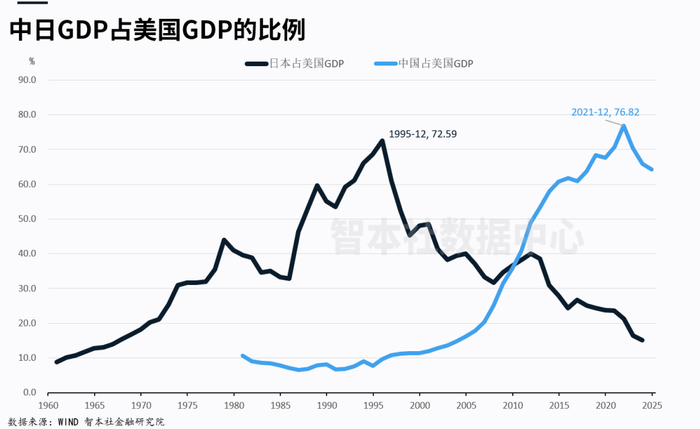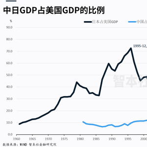 上个世纪七八十年代以来,日本较美国的相对经济优势持续扩大,日本GDP占美国的比重在1995年达到历史峰值的72%。