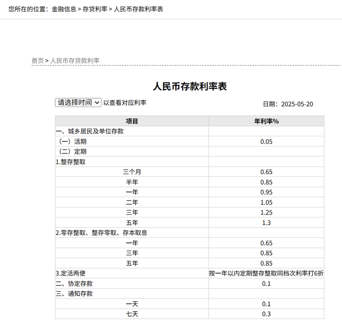5月20日,国有大行官网纷纷更新储蓄存款利率表、人民币存款利率表、挂牌利率表等,对存款利率进行更新。该次利率调整自2025年5月20日起执行。