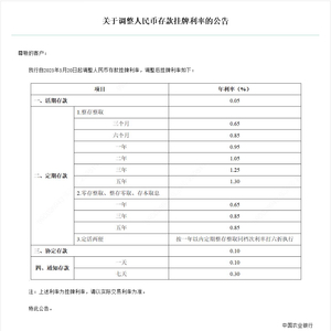 农业银行下调人民币存款利率,其中活期利率下调5个基点至0.05%;定期整存整取三个月期、半年期、一年期、二年期均下调15个基点,分别为0.65%、0.85%、0.95%、1.05%。
