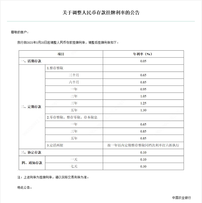 5月20日,农业银行(601288.SH)下调人民币存款利率,其中活期利率下调5个基点至0.05%;定期整存整取三个月期、半年期、一年期、二年期均下调15个基点,分别为0.65%、0.85%、0.95%、1.05%;三年期和五年期均下调25个基点,分别至1.25%和1.3%。定期零存整取、整存零取、存本取息三种期限均下调15个基点。7天期通知存款利率下调15个基点至0.3%。