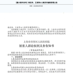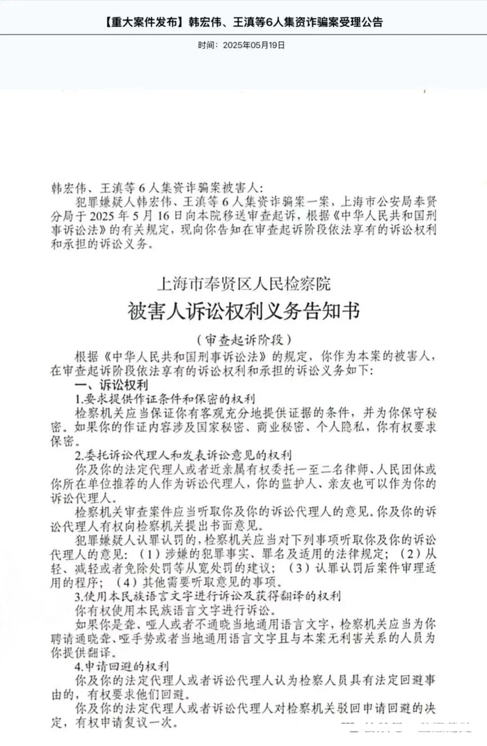 2025年05月19日,上海市奉贤区人民检察院【重大案件发布】:韩宏伟、王滇等6人集资诈骗案受理公告
