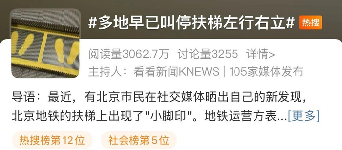 随后,“多地早已叫停扶梯左行右立”的话题于5月19日登社交平台热搜,引发关注。