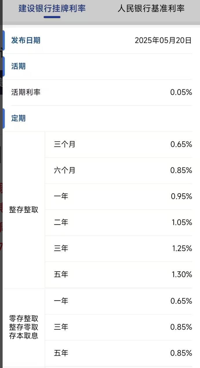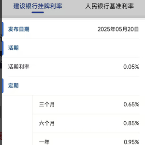 中国建设银行20日宣布下调人民币存款利率,其中活期利率下调5个基点至0.05%;定期整存整取三个月期、半年期、一年期、二年期均下调15个基点,分别为0.65%、0.85%、0.95%、1.05%;三年期和五年期均下调25个基点,分别至1.25%和1.3%。定期零存整取、整存零取、存本取息三种期限均下调15个基点。7天期通知存款利率下调15个基点至0.3%。