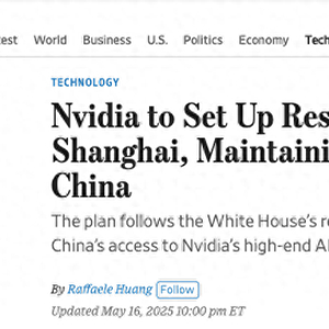 【环球网科技综合报道】5月20日,据《华尔街日报》报道,全球人工智能芯片巨头英伟达(Nvidia)计划在中国上海设立研发中心,以深化本土化研发能力。