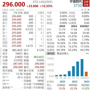 5月20日,宁德时代H股在港交所主板上市。宁德时代港股上市首日高开12.55%,报296港元,发行价为263港元。