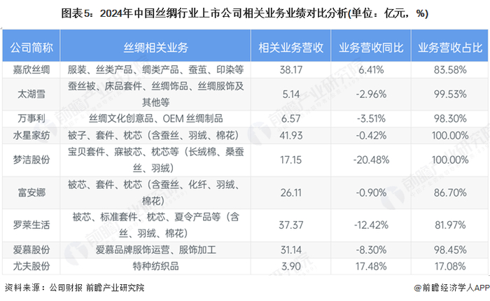丝绸产业的上市公司中,嘉欣丝绸的丝绸产业规模较大,年营收规模达38.17亿元,业务营收同比增长6.41^%,处于行业领头羊的地位;水星家纺、梦洁股份、富安娜、罗莱生活、爱慕股份的家纺或服装业务规模也较大,但其中包含羽绒、棉花类家纺或服装制品;尤夫股份作为化纤产业企业,其特种纺织品业务2024年营收3.9亿元,同比增长17.48%,反映出企业较大的成长性。