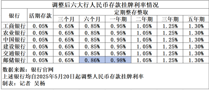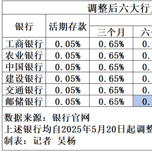 5月20日,工商银行、农业银行、中国银行、建设银行、交通银行、邮储银行六大行官网更新存款挂牌利率,自5月20日起下调人民币存款挂牌利率。