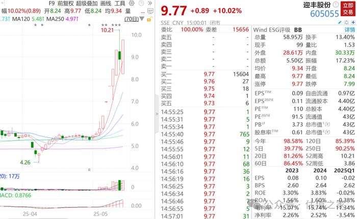 2025年5月19日,经过一天的短暂调整,迎丰股份(605055.SH)反包前一个交易日的下跌并再度涨停,而此前已经连续5个涨停板,短短一个月多的时间就实现了股价翻倍,估值PE(TTM)来到110倍。