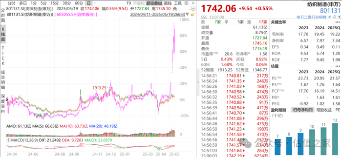迎丰股份主营业务为印染加工,属于纺织制造环节。过去两年迎丰股份的股价与申万纺织制造指数高度正相关,两者走势基本趋同。自5月7日工信部与商务部联合发布《关于开展2025纺织服装“优供给促升级”活动的通知》起,迎丰股份走出独立行情,超额收益达到80%以上。