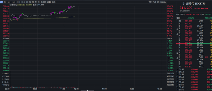 截至11时52分,宁德时代H股大涨18.327%,报311.200港元/股,发行价为263港元/股,总市值达1.41万亿港元。