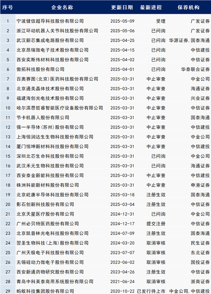 部分进程暂未列入,如有需要可留言:已过会、已上市、终止审查、不予核准、不予注册、终止注册。