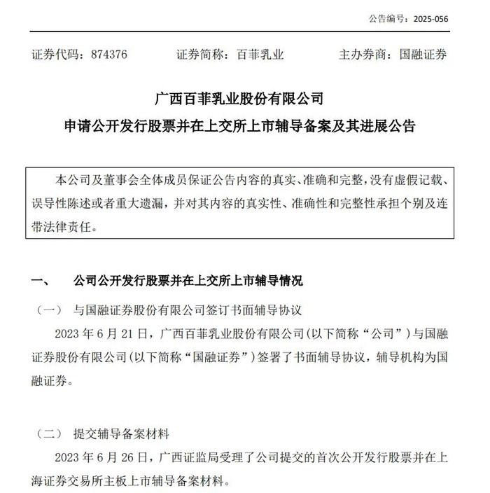 2025年5月14日,百菲乳业综合考虑发展战略,公司将上市辅导备案板块由北京证券交易所变更为上海证券交易所主板。