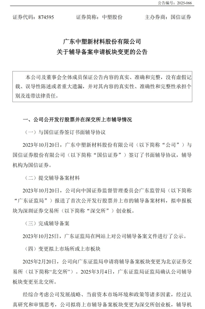 2025年5月7日,中塑股份综合考虑公司发展战略、当前资本市场环境和政策等诸多因素,公司将上市辅导备案板块由北交所变更为深交所创业板。