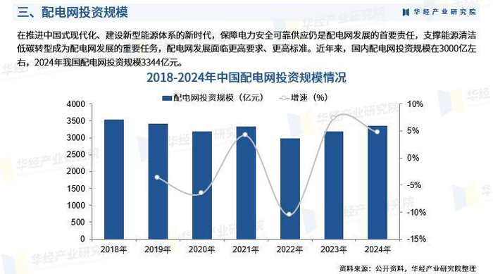在推进中国式现代化、建设新型能源体系的新时代,保障电力安全可靠供应仍是配电网发展的首要责任,支撑能源清洁低碳转型成为配电网发展的重要任务,配电网发展面临更高要求、更高标准。近年来,国内配电网投资规模在3000亿左右,2024年我国配电网投资规模3344亿元。