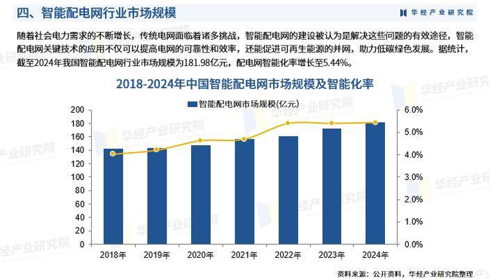 随着社会电力需求的不断增长,传统电网面临着诸多挑战,智能配电网的建设被认为是解决这些问题的有效途径,智能配电网关键技术的应用不仅可以提高电网的可靠性和效率,还能促进可再生能源的并网,助力低碳绿色发展。据统计,截至2024年我国智能配电网行业市场规模为181.98亿元,配电网智能化率增长至5.44%。