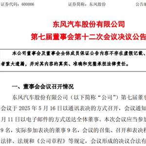 近日,东风汽车股份有限公司发布第七届董事会第十二次会议决议公告。东风汽车股份有限公司(以下简称“公司”)第七届董事会第十二次会议于2025年 5月16日以通讯表决的方式召开。本次会议审议了三项议案,其中两项事关人事变动。