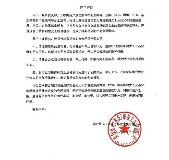 5月16日,@嘉行传媒 发布严正声明:社会公众的合理监督是维护社会公正和法治的重要力量,我司、黄杨钿甜女士及其父母愿意接受社会公众的合理监督,但绝不姑息任何恶意造谣的侵权行为,恳请大家勿信谣、勿传谣。