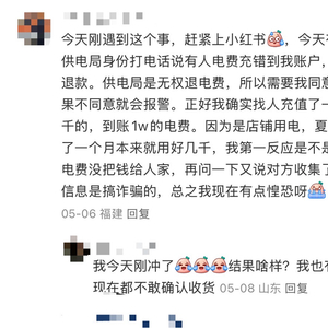 一位网友就分享了她的亲身经历:她通过第三方渠道以 9 折优惠充值 9000 元电费(实际到账 1 万元),最近她接到供电局工作人员的电话,对方称有人将电费充错到她的账户,需要她同意协助退款,如不同意将会报警处理。在后续沟通中,工作人员透露,这些充值订单涉及诈骗资金。