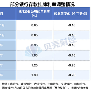 5月20日,六大国有银行、招商银行等多家银行再度下调了存款挂牌利率。上述银行的1年定期存款挂牌利率首次跌破1%;3年及5年定期存款利率均下调了25个基点。不仅如此,部分银行还调整了大额存单等存款产品的挂牌利率。