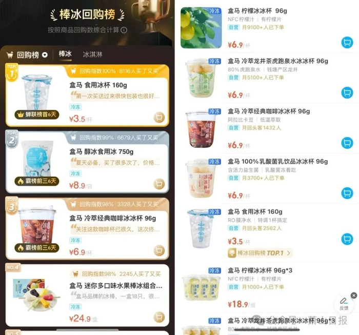 不过,就销售量上来看,纵使口感如何多变,消费者眼里不变的“白月光”,依旧是食用冰杯。盒马棒冰回购榜上,食用冰杯已蝉联榜首6天,回购指数100%,超8000人回购。