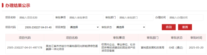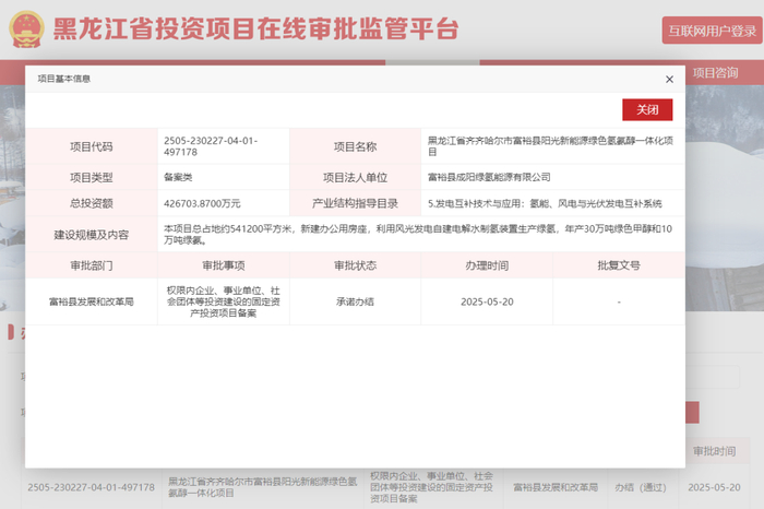5月20日,黑龙江省投资项目在线审批监管平台信息显示,黑龙江省齐齐哈尔市富裕县阳光新能源绿色氢氨醇一体化项目通过备案。