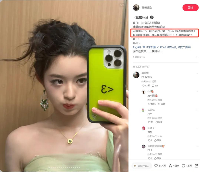 这一系列信息,源于黄杨钿甜5月11日在社交平台上分享的成人礼照片。照片中,黄杨钿甜佩戴的耳环被指认是奢侈品牌GRAFF经典系列,官方售价约230万元。大量网友认为,2007年出生的黄杨钿甜,作为年轻演员,不应该有如此高的消费水平。