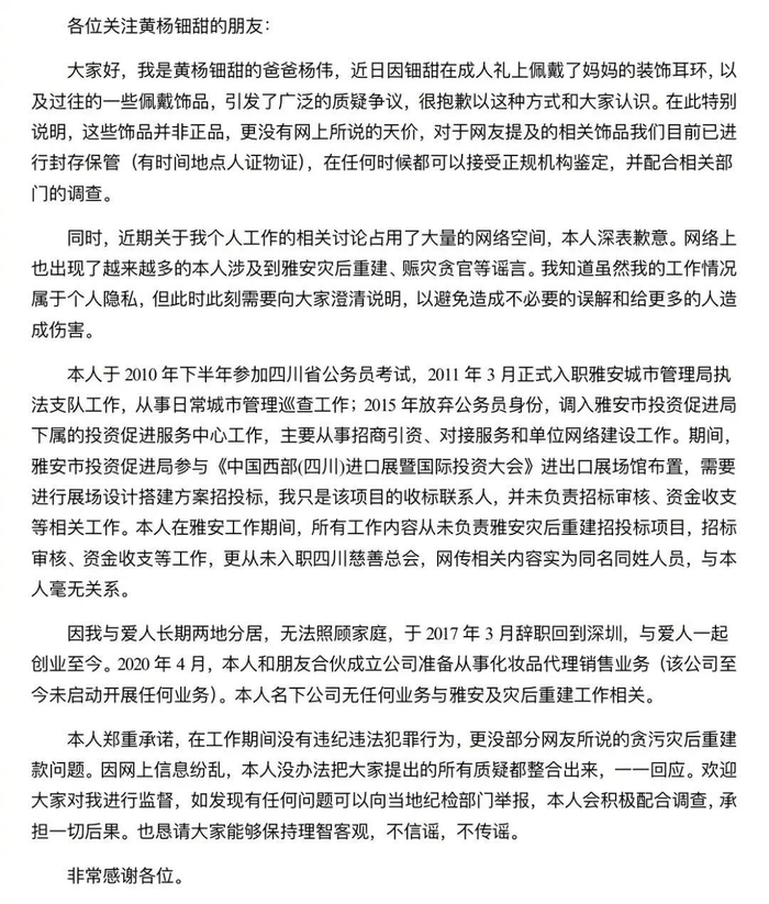 5月16日晚,女演员黄杨钿甜父亲 @黄杨爸爸 发文,回应女儿相关争议:耳环不是正品,涉及的雅安灾后重建、赈灾贪官等传言是谣言。