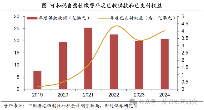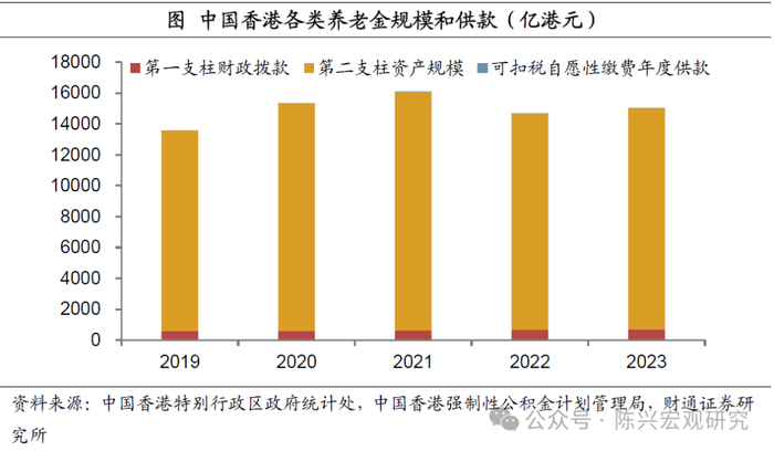 第二支柱是中国香港养老金体系的主体部分。从结构来看,第二支柱是中国香港养老金最主要的部分,截至2023年末,中国香港公共养老金财政拨款规模达726亿港元,主要为贫困老年人提供兜底保障;第二支柱作为核心,通过强制性储蓄为大多数劳动者提供退休保障,2023年末资产规模超1.4万亿港元;第三支柱则通过个人自愿储蓄和投资,为居民提供额外的养老资金支持,其中可扣税自愿性缴费年度供款不到20亿港元。