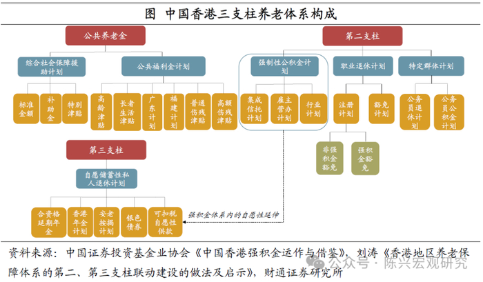 以强积金为核心的养老金体系。中国香港养老金采用世界银行提倡的多支柱模式,但三支柱的定位及结构有明显差异。首先,中国香港并未建立由政府管理的传统养老金第一支柱,特区政府仅为资产和收入低于标准的老年人提供基本生活保障,实行由政府负担、社会福利署推行的综合社会保障援助计划和公共福利金计划;其次,第二支柱职业养老金以强制性公积金计划为主,以职业退休计划为辅,此外,第二支柱还包括特定群体养老金计划;最后,第三支柱为私人自愿退休储蓄计划,主要包括香港年金计划、安老按揭计划、合资格延期年金、可扣税自愿性供款和银色债券等。