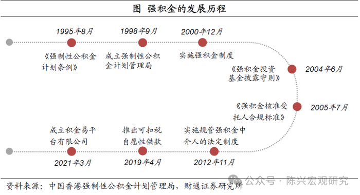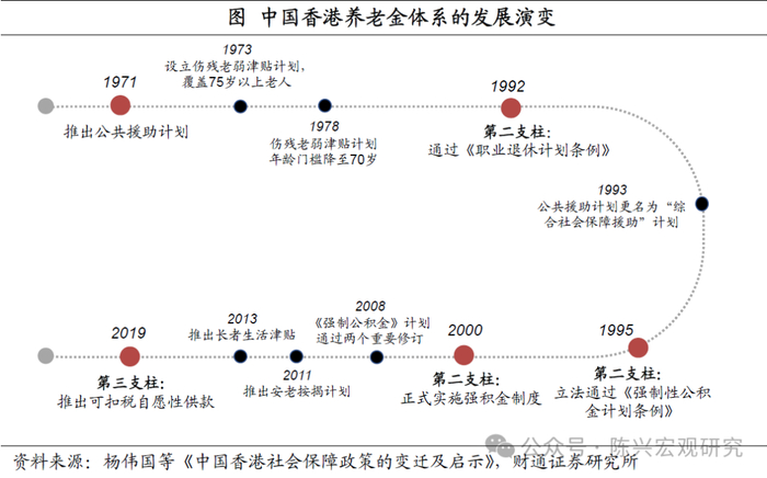 中国香港养老金多支柱体系逐步建成。中国香港养老金体系的建立与发展,经历了从民间自救到政府主导、从单一救助到多层次保障的转型,最终构建了多支柱的养老保障体系。1970年以前,中国香港社会保障以民间慈善团体和教会提供的救济为主。1971年,中国香港政府推出公共援助计划,给需要帮助的市民提供包括现金援助在内的各类福利服务,成为中国香港首个制度化的社会救助体系。1992年12月,中国香港政府通过了《职业退休计划条例》,允许企业自愿设立退休计划,是第二支柱的早期探索。1995年,中国香港政府立法通过《强制性公积金计划条例》,并于2000年正式实施强积金制度,标志着第二支柱正式形成。2019年,中国香港强积金局推出可扣税自愿性供款,被视为中国香港养老保障体系的第三支柱。