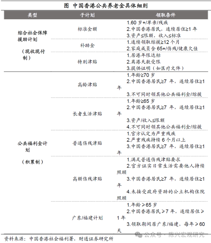 公共养老金由政府财政承担。中国香港公共养老金的资金来源主要是财政税收,有综合社会保障援助计划(CSSA,简称“综援”)和公共福利金计划(SSA)两种,由中国香港特别行政区政府社会福利署(SWD)负责统筹和执行。其中,综合社会保障援助计划作为兜底机制,采用“标准金额+补助金+特别津贴”的三层给付结构,为贫困长者报销刚性支出并提供生活补助;公共福利金计划面向全体长者提供高龄津贴和资产审查制的长者生活津贴,面向全体严重残疾人士提供普通伤残津贴和高额伤残津贴,同时通过广东、福建计划支持跨境养老。