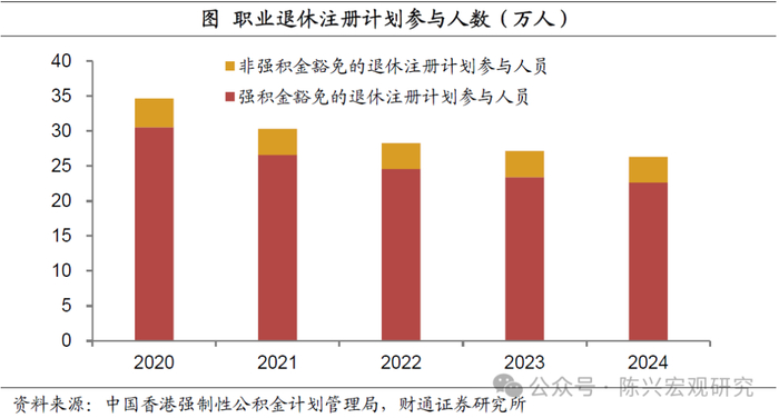 注册计划分为强积金豁免和非强积金豁免两类。强积金豁免计划允许成员完全替代强积金,非强积金豁免计划成员仍需参与强积金制度,其职业退休计划作为补充安排,这两类都包含DC和DB两种模式。两类计划的核心区别在于强积金豁免计划可完全替代法定供款义务,而非强积金豁免计划仅作为补充,成员仍需履行强积金供款责任。近年来,职业退休注册计划的参与人数逐年递减,截至2024年末,强积金豁免和非强积金豁免的退休注册计划参与人数分别缩减至22.6万人和3.7万人。从结构来看,职业退休注册计划大部分为强积金豁免,截至2024年末,强积金豁免计划的规模为2766亿港元,非强积金豁免计划仅167亿港元。