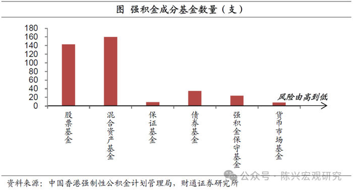 雇员自行选择强积金计划中的成分基金。第二支柱养老金中的强积金计划通常分三个投资层级,首先,由雇主为雇员选定参与的强积金计划。其次,由雇员自行选择要投资的成分基金,强积金有六种主要的成分基金,分别为股票基金、混合基金、债券基金、保证基金、强积金保守基金、不包含强积金保守基金的货币市场基金。最后,每个强积金计划至少需要包含3只或3只以上的成分基金供计划成员进行投资选择,其中1只必须是强积金保守基金。成分基金可以直接投资于底层资产,也可以投资于1只或多只核准汇集投资基金,核准汇集投资基金的形式为保险单、单位信托或公募基金。截至2024年末,市场上共有379支成分基金,其中143支股票基金、160支混合资产基金、35支债券基金、9支保证基金、24支强积金保守基金和8支不包含强积金保守基金的货币市场基金。