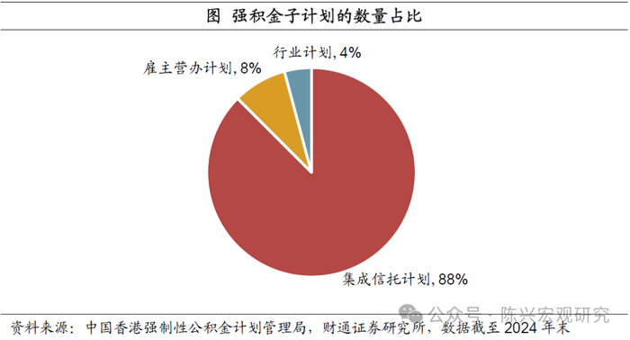 集成信托计划是最常见的强积金计划类型。具体来看强积金制度,可以分为集成信托计划、雇主营办计划和行业计划三种,集成信托计划依托规模效应降低管理成本,雇主营办计划侧重企业个性化需求,行业计划则解决特定行业的人员流动痛点,共同构建了多层次的退休储蓄体系。首先,集成信托计划是主流模式,允许不同雇主的雇员及自雇人士共同参与,通过集合管理供款优化运营效率,2024年,市场上24个强积金计划中有21个为集合信托计划。其次,雇主营办计划主要针对大型企业,仅限同一雇主及其关联公司的雇员加入,便于企业定制化管理退休福利,目前市场上仅有2个此类计划。最后,行业计划专为雇员流动性较高的饮食业和建造业量身打造,允许员工在转职时保留账户,避免频繁更换计划带来的行政成本,截至2024年底仅有1个行业计划运作。