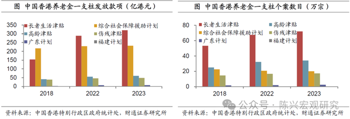 长者生活津贴是公共养老金最重要的部分。在中国香港养老金公共养老金的各计划中,长者生活津贴面向65岁或以上有经济需要的香港居民,只要符合居港要求和经济状况限制均可申请,因此实施范围最广、受益人数最多,2023年,有大约72万名长者受惠长者生活津贴,共发放款项320亿港元。相较而言,综合社会保障援助计划主要针对经济困难的老年人,但申请条件更为严格,受益人数相对较少,2023年仅资助20万人,发放款项232亿港元。