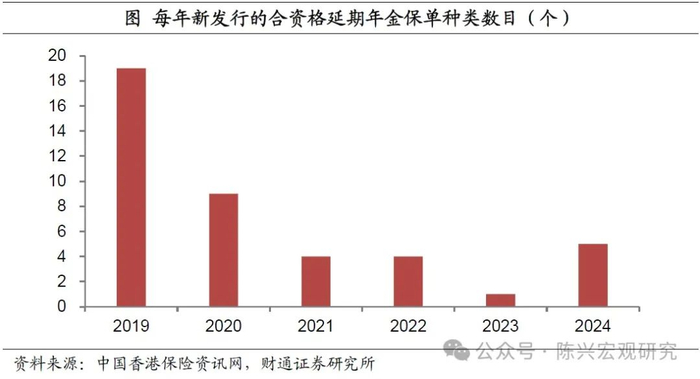 合资格延期年金是税优型退休工具。合资格延期年金(QDAP)由商业保险公司提供并经保险业监管局认证,包括累积期和年金领取期两个阶段。在累积期,投保人在一段特定时间内定期支付保费,让保险公司通过投资令金额增长。到了年金领取期,投保人可在期内定期收取年金,有部分延期年金保单则会相隔一段时间方会进入年金领取期。QDAP最大吸引力在于保费可享受每年最高6万港元的税务扣除(与可扣税自愿性供款共享上限),缴费期和年金期灵活,适合中高收入人群。2024年前三个季度保险公司共发出约5.8万份合资格延期年金保单,涉及保费37亿港元。截至2025年3月,中国香港保险公司已累计推出44种合资格延期年金产品,其中有一半合资格延期年金产品不再接受新投保申请。