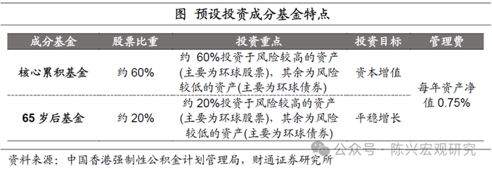 强积金计划也可选择预设好的投资方案。强积金计划除了上述参与人自主选择成分基金以外,也可按照预设投资策略(简称“预设投资”)进行投资。预设投资是由中国香港强制性公积金计划管理局统筹设计的一站式投资方案,由“核心累积基金”、“65岁后基金”两只混合资产基金构成,其中“核心累积基金”初期60%左右投资于股票等高风险资产,“65岁后基金”逐步将高风险资产比例降至20%以下,转向债券等稳健配置以降低临近退休的市场波动风险。总的来看,预设投资一是自动风险调整机制,通过年龄触发的资产再平衡策略,随着成员接近退休自动减少风险敞口;二是费用透明化,法定收费上限为0.95%;三是全球化分散投资,减少单一市场风险。