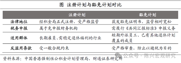 注册计划较豁免计划的监管更严。进一步来看职业退休计划,可以分为注册计划与豁免计划两类职业退休安排。一方面,注册计划是由雇主自愿建立,并按照《职业退休计划条例》向积金局申请注册的职业退休计划。注册计划的规则和条款由雇主自行制定,具有较高的灵活性。另一方面,豁免计划是指在满足一定条件下,获得积金局豁免证明书的职业退休计划,这些计划通常需要符合特定的法律和监管要求。两类计划的核心区别在于注册计划需履行注册程序并接受常规监管,而豁免计划通过满足预设条件获得监管豁免。