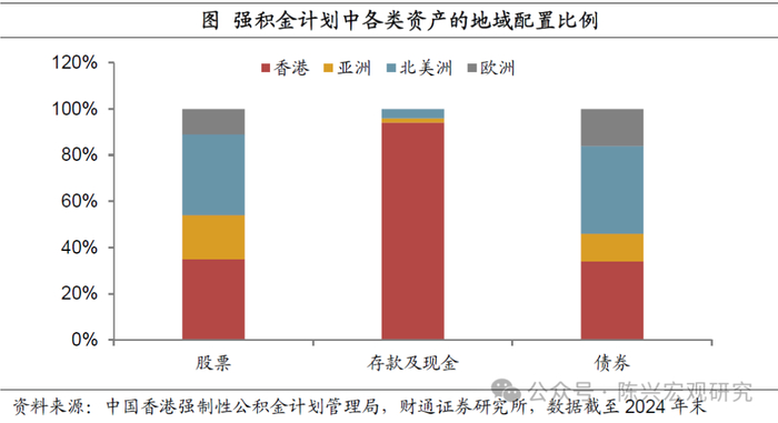 强积金主要投资中国香港市场。从投资区域来看,强积金计划下的成分基金可投资于全球市场,包括中国香港市场、亚洲市场(不含中国香港、日本,但包含澳大利亚、新西兰及印度)、北美洲市场和欧洲市场。根据中国香港强制性公积金计划管理局统计,截至2024年末,中国香港强积金55%的资金投资于中国香港市场,其余资金主要投资于发达国家市场。