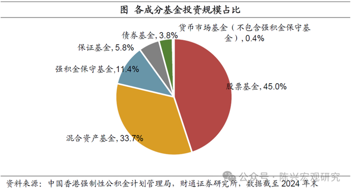 成分基金中近一半为股票基金。从风险和收益来看,股票基金主要投资全球股票市场,风险最高但长期收益潜力较大;混合资产基金通过股债配置平衡风险与收益;债券基金以政府债、企业债为主要标的,收益较稳定;保证基金提供最低回报保障但管理费较高;强积金保守基金和货币市场基金以货币市场工具或短期存款为主,几乎无风险但收益最低。截至2024年末,强积金计划45%的资金投资于股票基金,34%的资金投资于混合资产基金,11%的资金投资于强积金保守基金,投资于保证基金、债券基金和货币基金的比例不高。