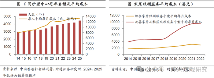 社区照顾服务是中国香港长期照护的主流。在中国香港的长期照护中,社区照顾服务是主流,即居家和社区环境中接受的日间照护支持,过去社区照顾服务一是“家居为本”的综合家居照顾服务和改善家居及社区照顾服务,二是“中心为本”的长者日间护理中心等机构。2024年,综合家居照顾服务和改善家居及社区照顾服务进行了重整,将两者中轻度个体的服务整合为家居支援服务,重度个体的服务整合为体弱长者家居照顾服务,整合之后,2024年家居志愿服务和体弱长者家居照顾服务预算的名额分别为15562人和13365人,每人平均每月成本分别为4618港元和1.04万港元。此外,长者日间护理中心的服务被看作是“家居为本”的家居支援服务和体弱长者家居照顾服务的补充,仅在不适宜提供居家照护服务的个案中才会考虑由正式照护单位接管老人的全面照护。