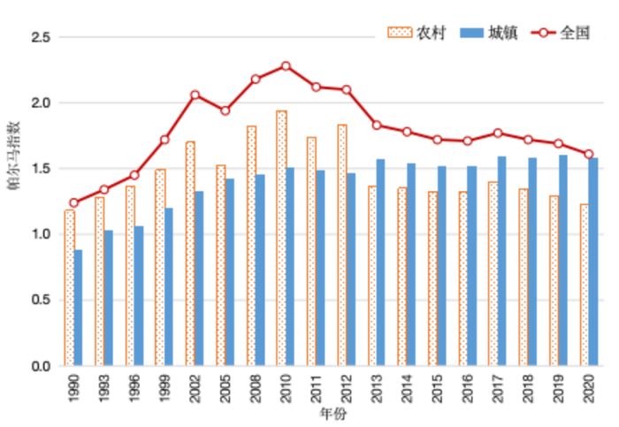 从中国的情况,也可以看到这个趋势。通过帕尔玛指数(人群中10%最高收入人口总收入与40%最低收入人口总收入的比值)可以发现:第一,2010年之后收入差距是缩小的。全国收入差距缩小,农村收入差距缩小,城镇略有扩大,但也比较稳定。第二,全国收入差距与城镇收入差距、农村收入差距是不一致的,全国收入差距更大,原因是全国收入差距中不仅包括城镇收入差距、农村收入差距,还包括城乡之间的收入差距。