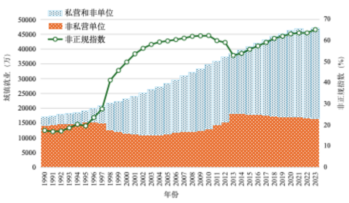 由于劳动力市场的波动、替代和调整,出现了非正规就业、非单位就业、灵活就业的新就业形态,这是目前的状况。所以,我们把私营就业和非单位就业在全部城镇就业中的比重,不严格地称为非正规指数。