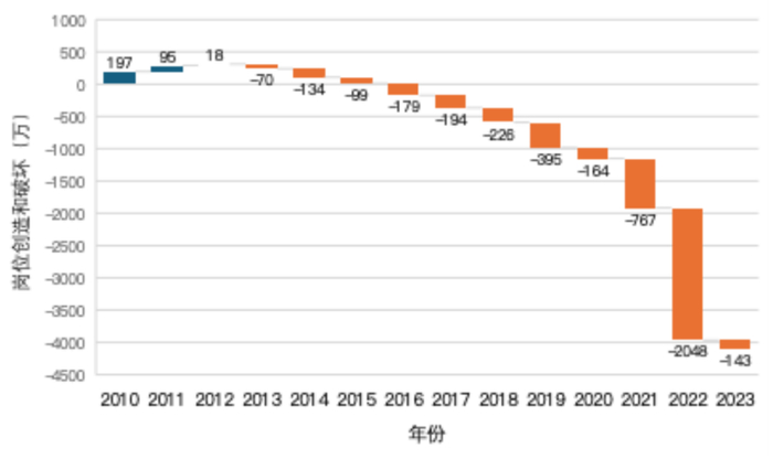 根据官方的数据,过去很多年的城镇新增就业都是1300万左右,我国劳动年龄人口早已经历负增长,为什么还会有这么多的新增就业?因为这里的1300万左右其实是“毛创造”,只记录了新增加的岗位,不记录损失的岗位。