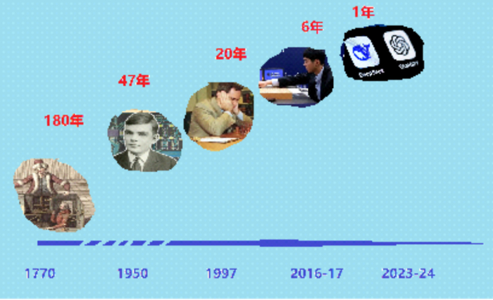 我用一张图来说明技术的快速进步和加速度。1770年,西班牙工程师发明了自动机器“象棋土耳其人”,虽然这后来被证明是骗局,但“人造智能”的想象力开始出现。180年后的1950年,图灵从科学理论上提出“人工智能”的概念。47年后的1997年,“深蓝”计算机战胜国际象棋世界冠军卡斯帕罗夫。20年后的2016-2017年,AlphaGo分别战胜围棋世界冠军李世石和柯洁。6年后的2023-2024年,ChatGPT大语言模型出现。在此之后的1年内,无数模型涌现,包括中国的DeepSeek。可见,人工智能的发展速度越来越快,影响越来越深远。