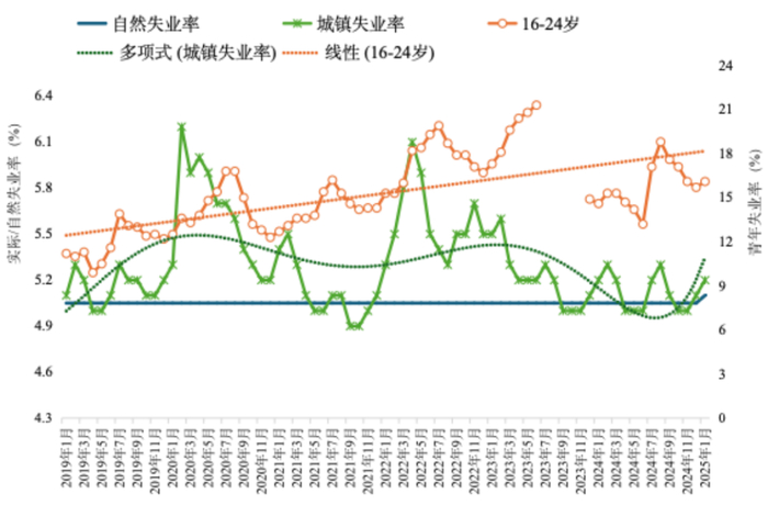 现在的问题是,在消除了劳动力市场周期性冲击以后,自然失业率也跟着提高了。早在新冠疫情暴发之前,估算的自然失业率大概是5.1%,相当于充分就业的失业率,是可以接受的水平。疫情冲击导致实际失业率高于自然失业率,说明三年里大多数时间处在周期性冲击之中,现在虽然逐渐回归自然水平,却保持在偏高的水平上。同时,青年失业率保持高位也是结构性矛盾加剧的表现。这都意味着自然失业率趋于提高,故关注点要从应对周期冲击转向解决结构性矛盾。