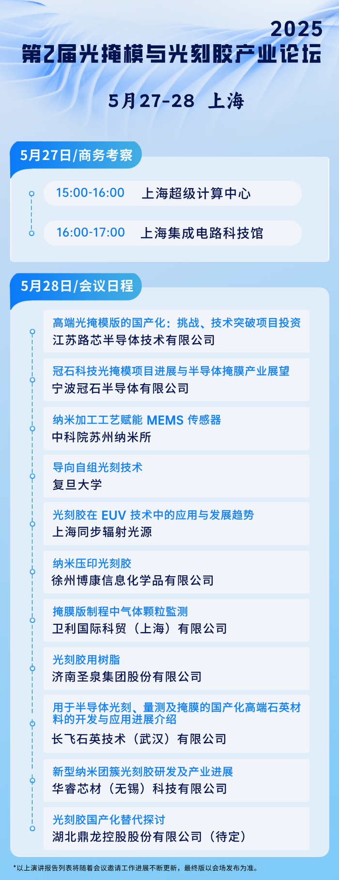 -江苏路芯、宁波冠石、圣泉集团、华睿芯材、徐州博康、中科院苏州纳米所、复旦大学、上海光源、长飞石英等企业的领导与专家将做大会报告,探讨中国光掩模版产业的技术进展、市场机遇与挑战,以及产业前景展望。
